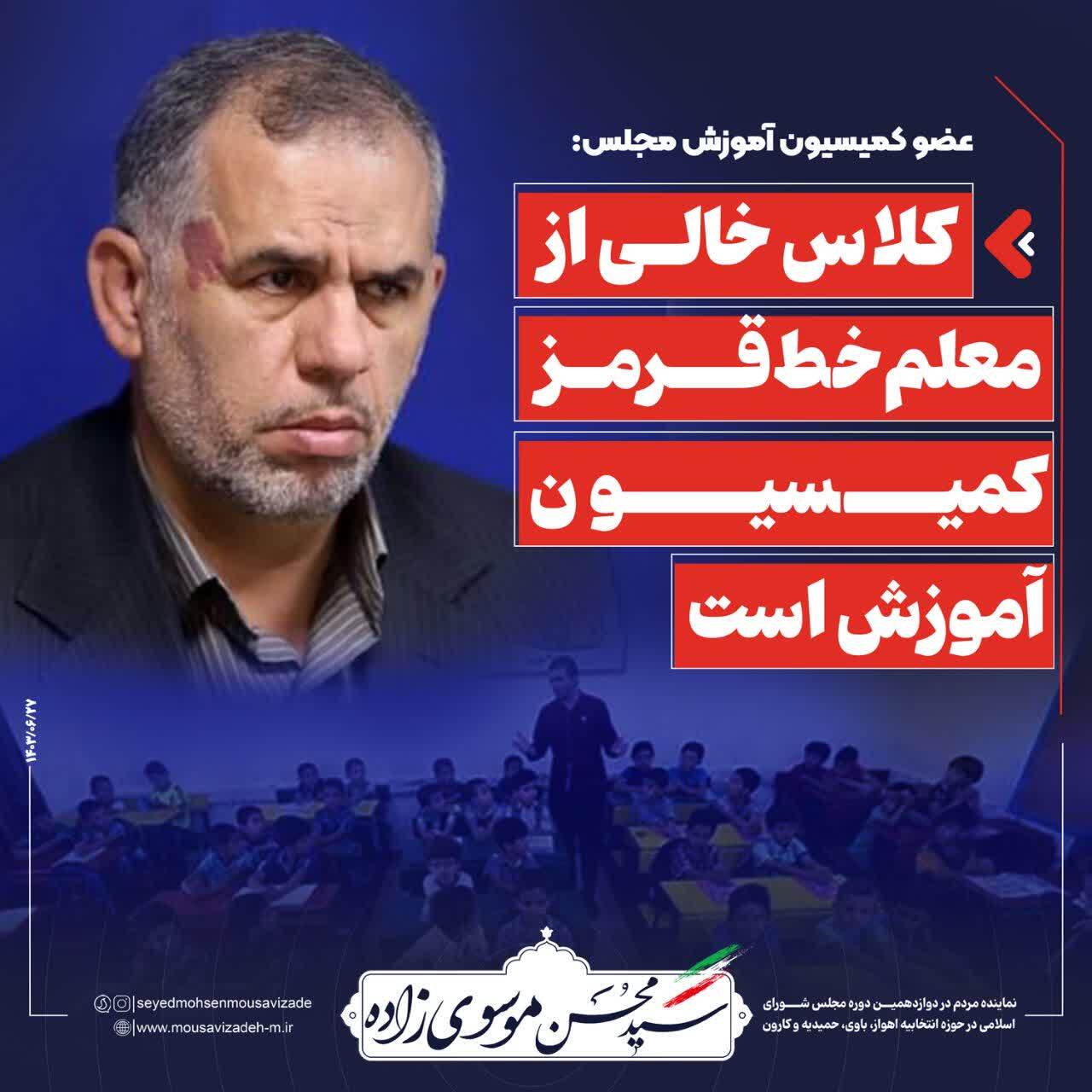 نماینده اهواز، کارون، باوی و حمیدیه در مجلس شورای اسلامی با بیان اینکه توزیع نامتوازن نیروی انسانی در برخی نقاط کشور در سطح آموزش و پرورش وجود دارد، گفت: دست آموزش و پرورش برای توزیع صحیح نیروی انسانی باز است و برای ما به عنوان کمیسیون آموزش مجلس، کلاس خالی از معلم در مهرماه خط قرمز است.
