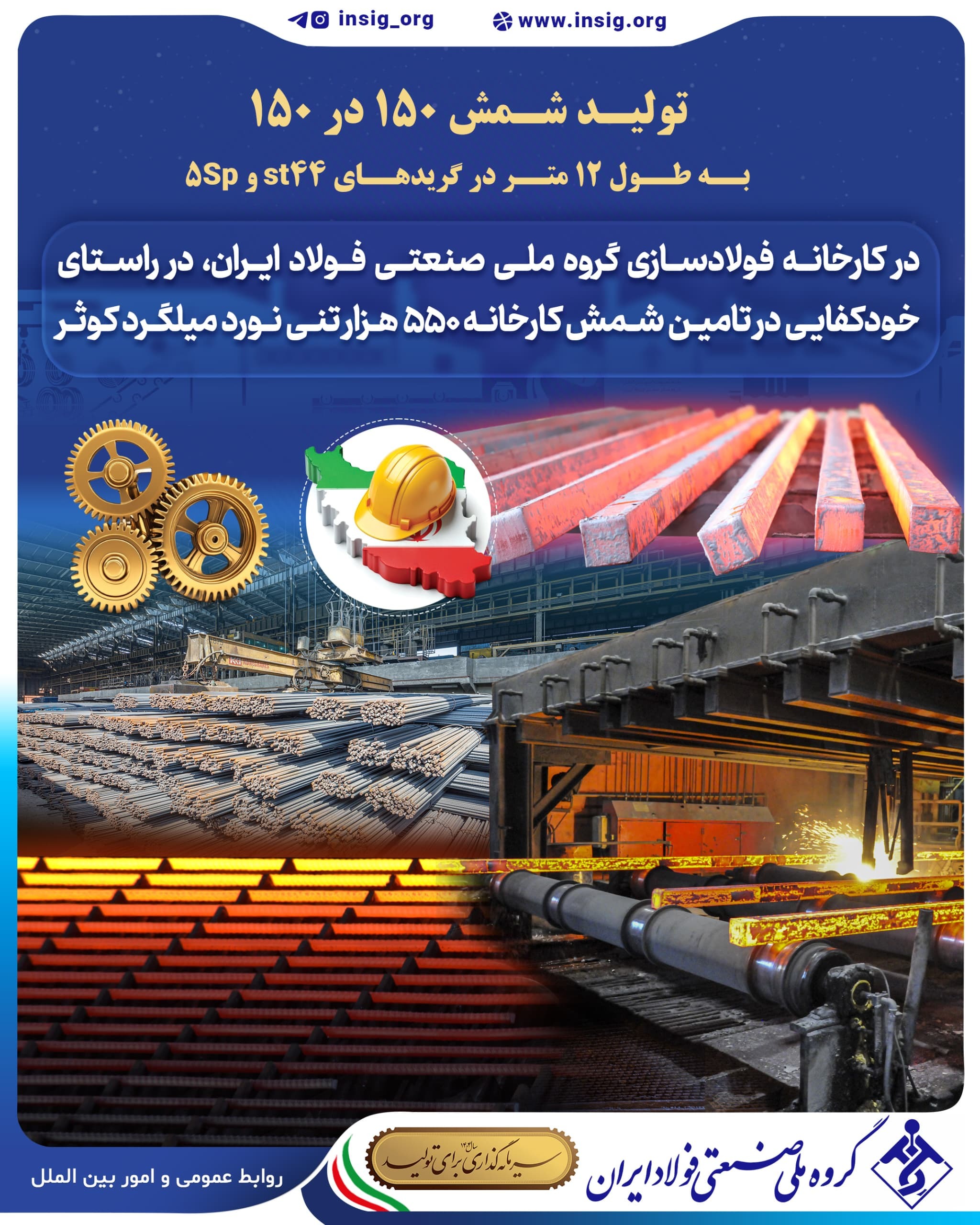 به گزارش روابط عمومی و امور بینالملل، با اعلام مهندس صادق پارسایی منش؛ معاون بهرهبرداری گروه ملی صنعتی فولاد ایران، با همت پولامردان کارخانه فولادسازی و پس از انجام تحقیقات تخصصی، شمش فولادی با گرید St44 و 5Sp در ابعاد ۱۵۰ در ۱۵۰ میلیمتر، با طول ۱۲ متر جهت تامین بخشی از نیاز کارخانه استراتژیک نورد کوثر تولید گردید.