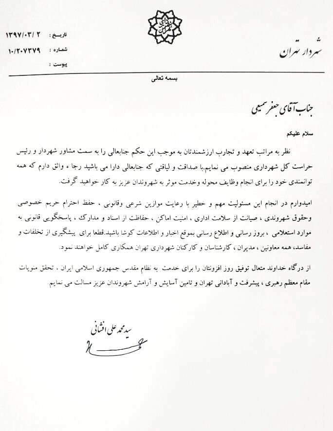 دیدارنیوز - با حکم سید محمدعلی افشانی، شهردار تهران، جعفر سمیعی به عنوان مشاور شهردار و رئیس کل حراست شهرداری تهران منصوب شد.