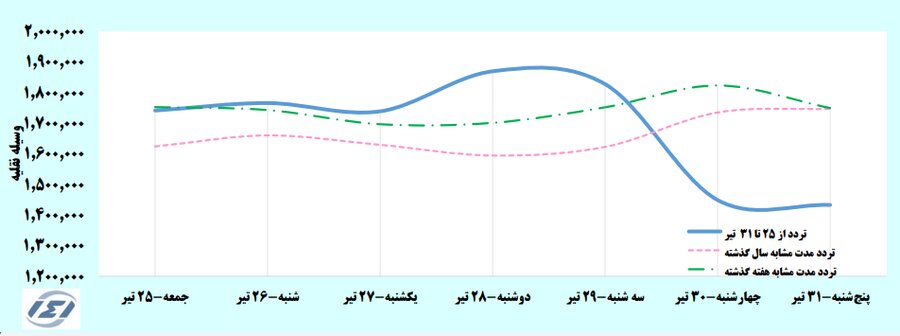 براساس جدیدترین گزارش مرکز مدیریت راههای کشور از تحلیل وضعیت تردد در بازه زمانی ۲۵ تا ۳۱ تیرماه نشان میدهد که متوسط تردد روزانه بین استانی از جمعه ۲۵ تیرماه تا پنجشنبه ۳۱ تیرماه یک میلیون و ۶۷۳ هزار و ۱۷۴ وسیله نقلیه بوده است که این آمار نسبت به مدت مشابه هفته قبل از این گزارش (۱۸ تا ۲۴ تیرماه) ۹ درصد کاهش یافته و تنها یک درصد نسبت به مدت مشابه سال گذشته افزایش داشته است.