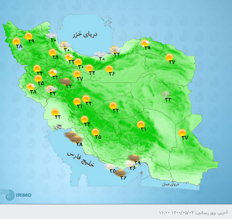 دیدارنیوز ـ براساس آخرین خروجی مدلهای هواشناسی ایران امروز ۴ مرداد برای استانهای آذربایجان شرقی، اردبیل، گیلان، مازندران، گلستان، هرمزگان و ارتفاعات البرز مرکزی در بعدازظهر و اوایل شب و فردا برای برخی نقاط استانهای واقع در سواحل دریای خزر و ارتفاعات البرز مرکزی رشد ابر و بارش پراکنده رخ خواهد داد.