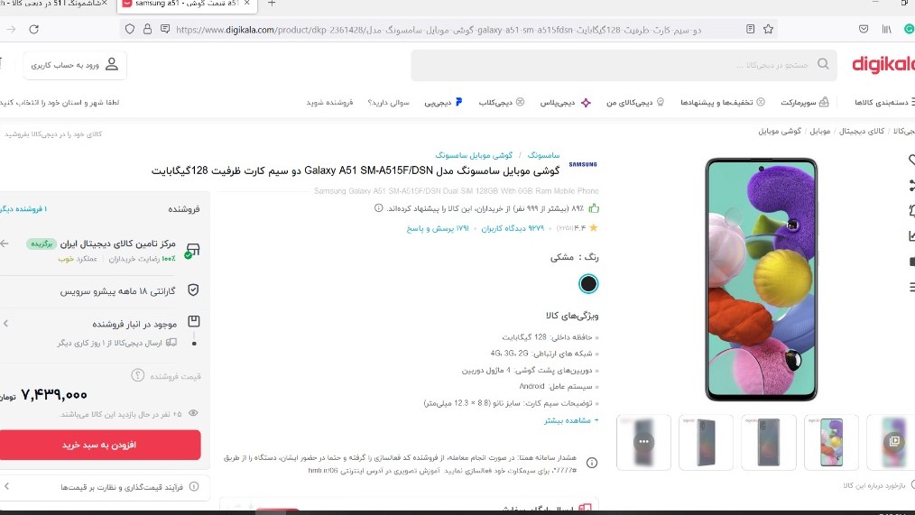 این فروشنده با بیان اینکه به ظور مثال قیمت گوشی موبایل سامسونگ مدل Galaxy A ۵۱ SM-A ۵۱۵ F/DSN دو سیم کارت ظرفیت ۱۲۸ گیگابایت در دیجی کالا ۷،۴۳۹،۰۰۰ تومان است، گفت: این گوشی در حال حاضر در بازار ۷ میلیون و ۱۰۰ هزار تومان به فروش میرسد که حدود ۴۰۰ هزار تومان در دیجی کالا گرانتر است.