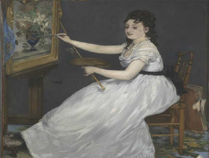 مدلِ صاحب نام این نقاشی یک نقاش امپرسیونیست فرانسوی است که در داخل تابلو نیز در حال کشیدن یک گلدان و گلهایش روی بوم تصویر شده است.