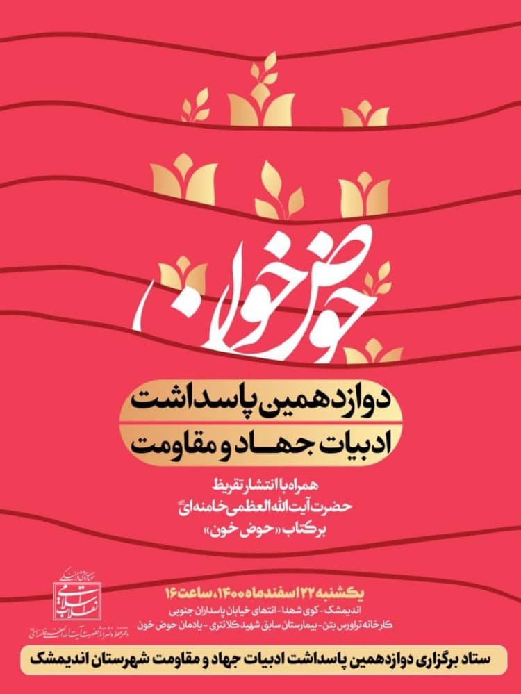 امروز ۲۲اسفندماه با رونمایی از تقریظ رهبر انقلاب بر کتاب "حوض خون" دوازدهمین پاسداشت ادبیات جهاد و مقاومت از سوی مؤسسه پژوهشی-فرهنگی انقلاب اسلامی برگزار خواهد شد
