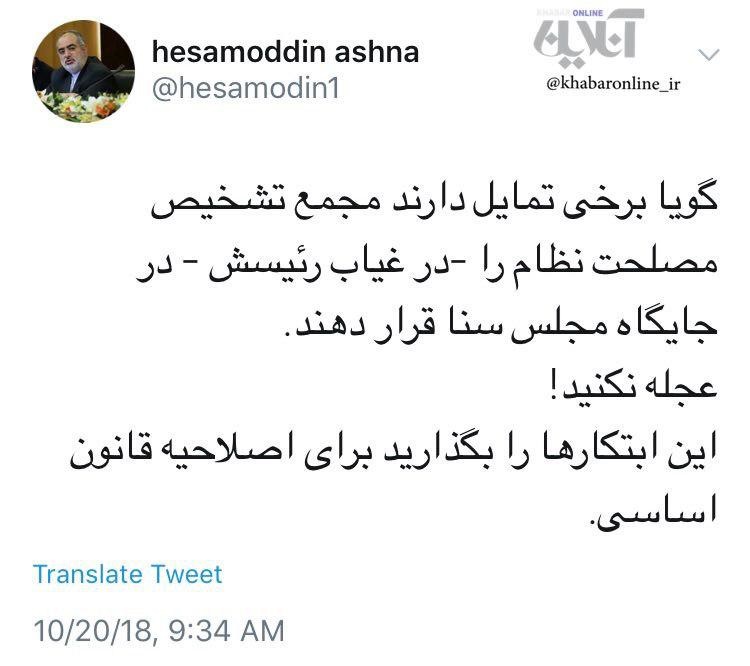 دیدارنیوز - حسام‌الدین آشنا مشاور رئیس‌جمهور در توئیتی نوشت: گویا برخی تمایل دارند مجمع تشخیص مصلحت نظام را -درغیاب رئیسش-در جایگاه مجلس سنا قرار دهند. عجله نکنید! این ابتکار را بگذارید برای اصلاحیه قانون اساسی.