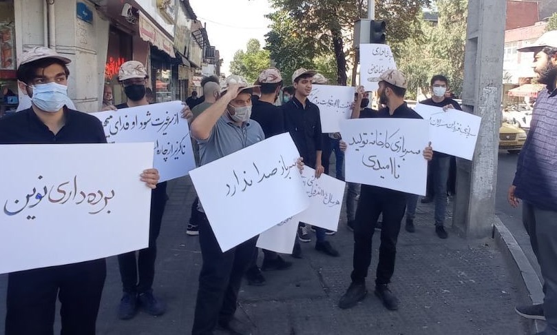 دانشجویان معترض پلاکاردهایی با شعارهای «‌برده‌داری نوین»، «‌سرباز صدا ندارد» و «‌سربازی، کارخانه تولید ناامیدی» در دست داشتند.