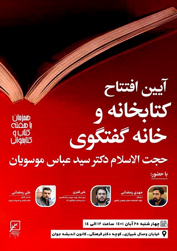 مراسم افتتاح کتابخانه و خانه گفتوگوی استاد سیدعباس موسویان روز چهارشنبه ۲۵ آبان از ساعت ۱۲ الی ۱۴ در محل کانون اندیشه جوان برگزار خواهد شد.