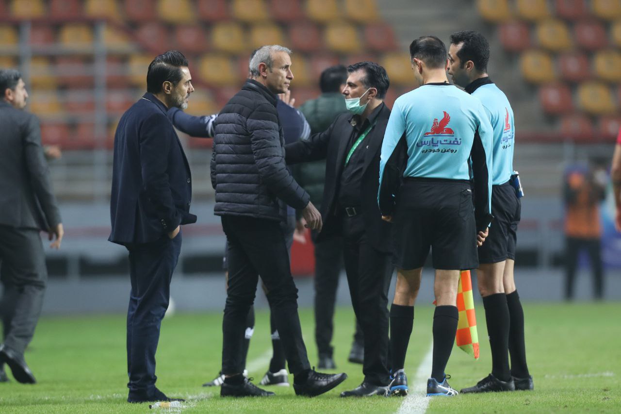 جواد نکونام به دلیل سریال اعتراضاتی که به موعود بنیادیفر داشت، در دقیقه ۶۰ از کنار زمین اخراج شد تا در ۳۰ دقیقه پایانی از روی سکوها تیمش را هدایت کند، اما اخراج نکونام باعث فروکش کردن حواشی و جنجالهای کنار زمین نشد و حتی تا بعد از سوت پایان مسابقه هم این جنجالها ادامه داشت و مهمترین بخش حواشی مسابقه روز گذشته مرتبط با نشست خبری بعد از بازی بود که کادرفنی ۲ تیم به شدت علیه یکدیگر موضعگیری کردند.