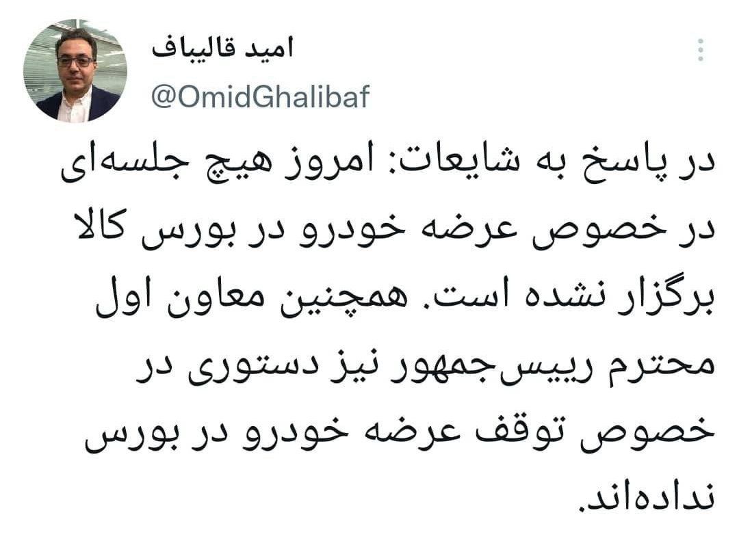 دیدارنیوز: قالیباف در حساب کاربری خود در شبکههای اجتماعی در پیامی نوشت: "پاسخ به شایعات: امروز هیچ جلسهای در خصوص عرضه خودرو در بورس کالا برگزار نشده است. همچنین معاون اول محترم رییسجمهور نیز دستوری در خصوص توقف عرضه خودرو در بورس ندادهاند. "