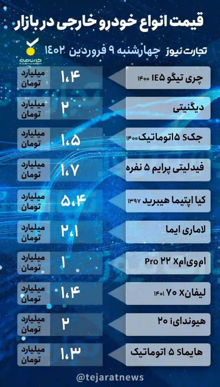 قیمت خودرو روز چهارشنبه، نهم اسفند ۱۴۰۲، با توجه به آمار و قیمت روزانه سایت کارنامه با تغییراتی همراه شد.