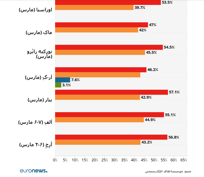 نتایج نظرسنجیهای انجام شده از سوی ۱۸ موسسه افکارسنجی در ماه جاری میلادی، آوریل و مارس ۲۰۲۳، نشان میدهد که در هیچیک از آنها میزان محبوبیت اردوغان از ۵۱.۴ درصد فراتر نرفته، ولی در مقابل، قلیچداراوغلو در برخی نظرسنجیها تا ۵۷ درصد از نظر مثبت رای دهندگان را جلب کرده است.