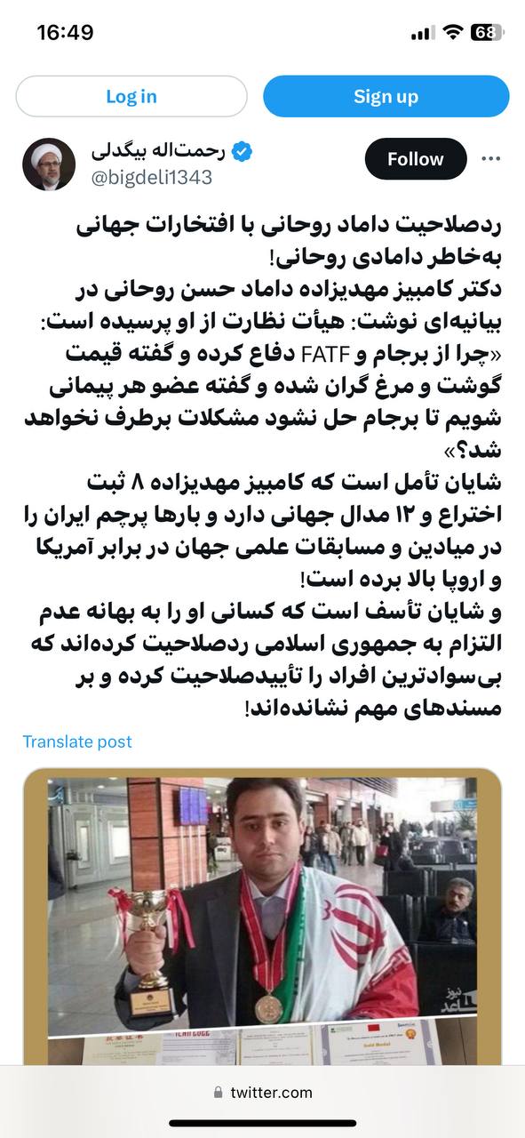 بیگدلی در صفحه اجتماعی خود نوشت: «ردصلاحیت داماد روحانی با افتخارات جهانی بهخاطر دامادی روحانی!