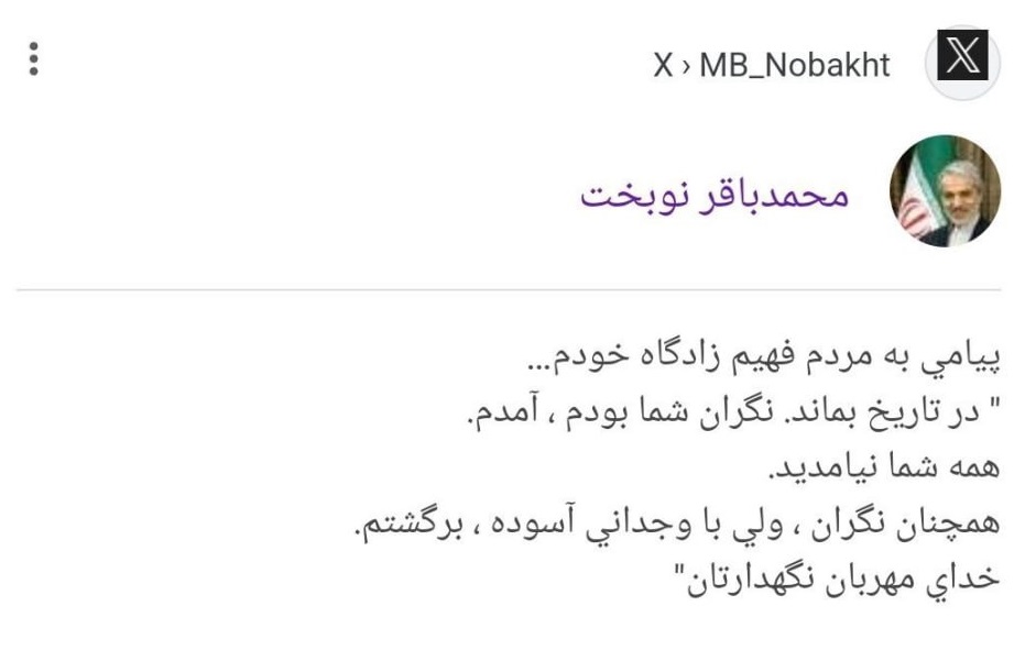 محمدباقر نوبخت، معاون رئیس جمهور در دوران حسن روحانی، پیامی برای مردم زادگاهش رشت پس از انتخابات ۱۱ اسفند منتشر کرده. او که در این انتخابات پیروز نشد، نوشت: