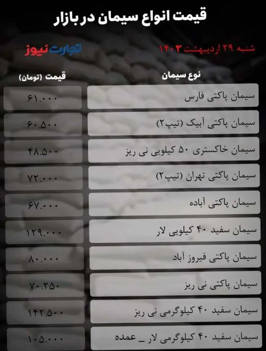 همچنین با واگذاری عرضه سیمان به بورس کالا، میزان عرضه و تقاضا در تعیین قیمت سیمان بیتاثیر نبوده است. در ادامه به قیمت هر پاکت از انواع سیمان پرداخته شده است.