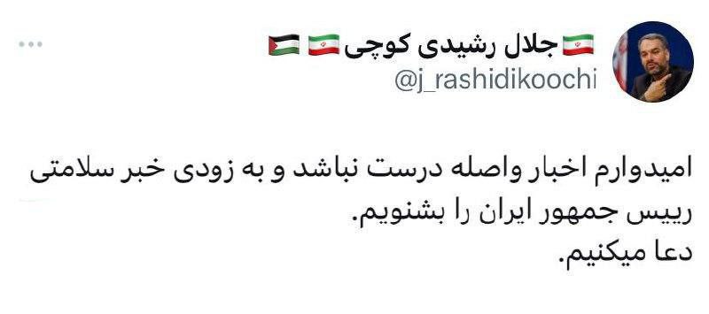 جلال رشیدی کوچی، نماینده مجلس یازدهم نوشت: امیدوارم اخبار واصله درست نباشد و به زودی خبر سلامتی رئیس جمهور ایران را بشنویم. دعا می‌کنیم.