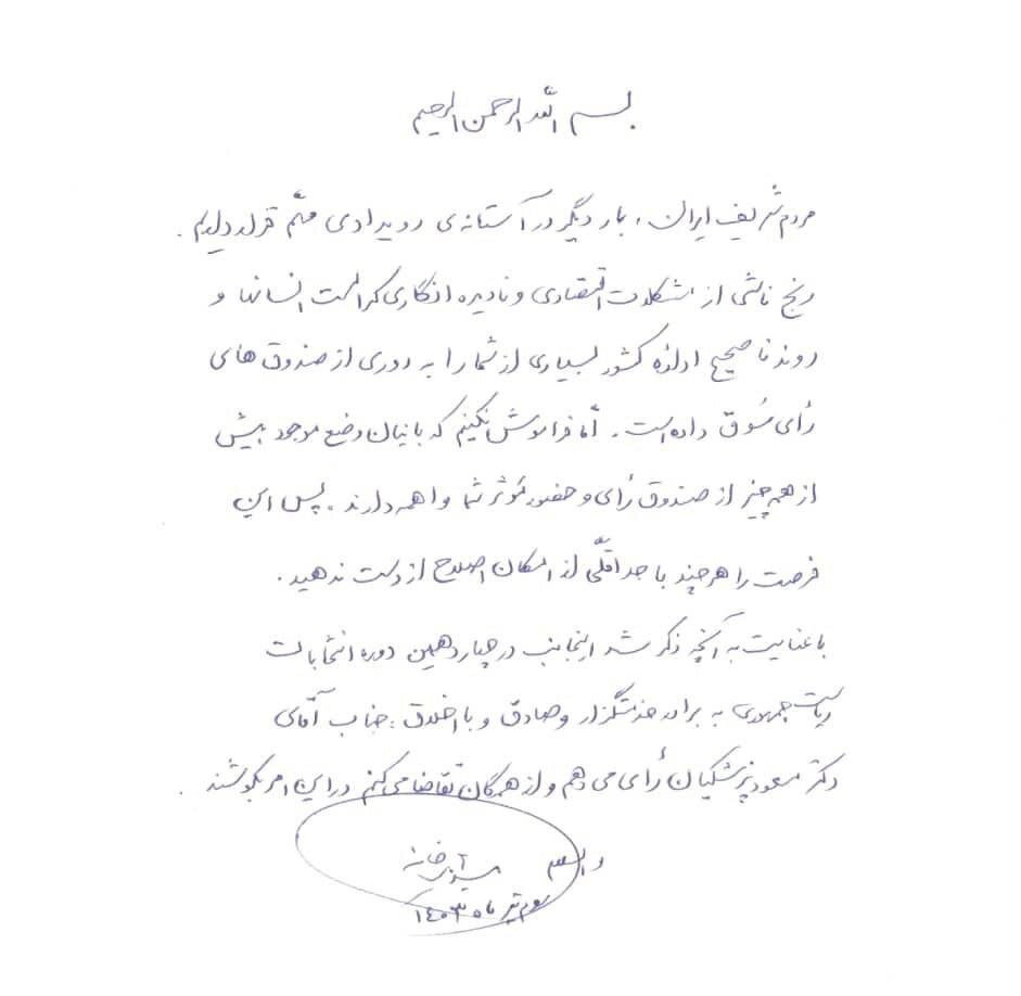 اما فراموش نکنیم که بانیان وضع موجود بیش از همه چیز از صندوق رای و حضور موثر شما واهمه دارند. پس این فرصت را هر چند با حداقلی از امکان اصلاح از دست ندهید. با عنایت به آنچه ذکر شده اینجانب در چهاردهمین دوره انتخابات ریاست جمهوری به برادر خدمتگزار و صادق و با اخلاق جناب آقای مسعود پزشکیان رای میدهم و از همگان تقاضا میکنم در این امر بکوشند.»