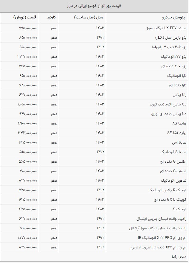 با مطالعه جدول زیر اطلاعات کاملی درباره قیمت روز خودروهای ایرانی در بازار به دست خواهید آورد.