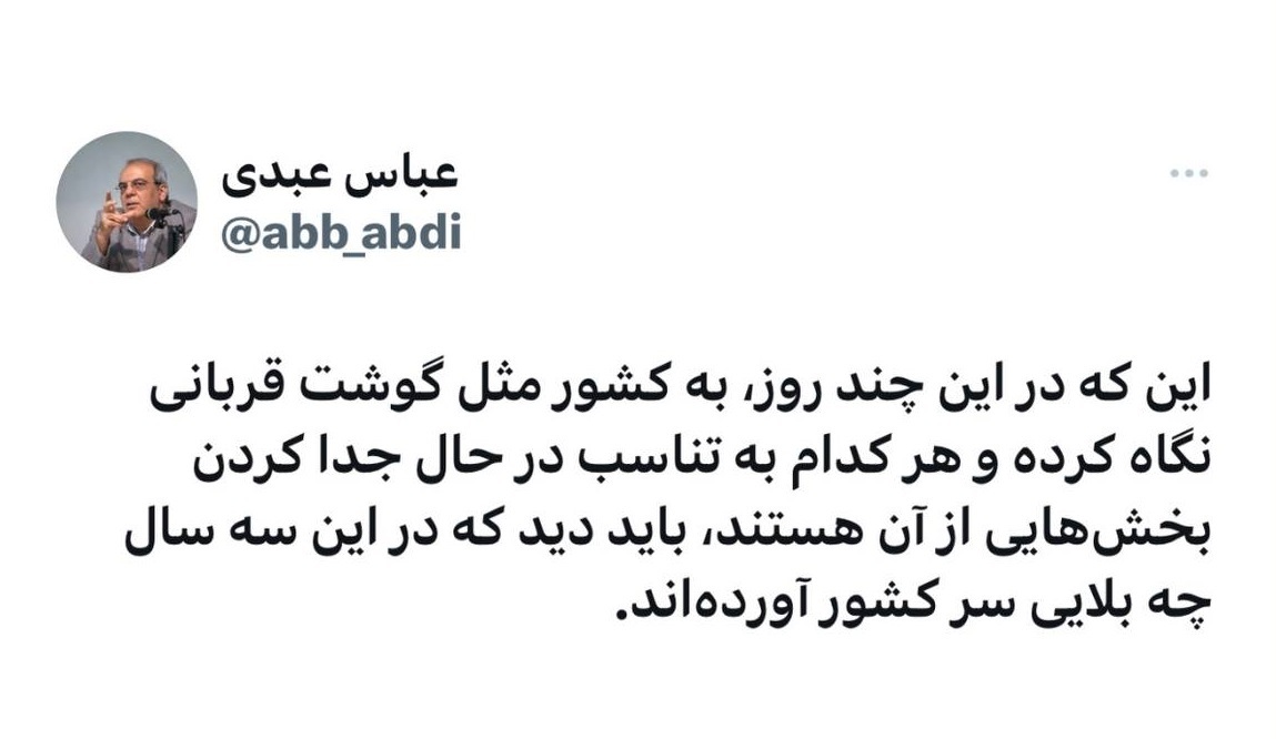 عباس عبدی، فعال سیاسی و تحلیل‌گر مسایل اجتماعی که پیش از این دولت سیزدهم را ناکارآمد خوانده بود؟، نوشت: این که در این چند روز، به کشور مثل گوشت قربانی نگاه کرده و هر کدام به تناسب در حال جدا کردن بخش‌هایی از آن هستند، باید دید که در این سه سال چه بلایی سر کشور آورده‌اند.