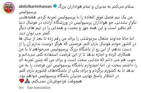 عبدالکریم حسن، مدافع چپ تیم فوتبال پرسپولیس که صحبت‌های زیادی مبنی بر جدایی‌اش از جمع سرخپوشان مطرح می‌شود، امروز با انتشار پیامی در صفحه شخصی‌اش خواستار موافقت باشگاه پرسپولیس با بازگشتش به لیگ فوتبال قطر شد.