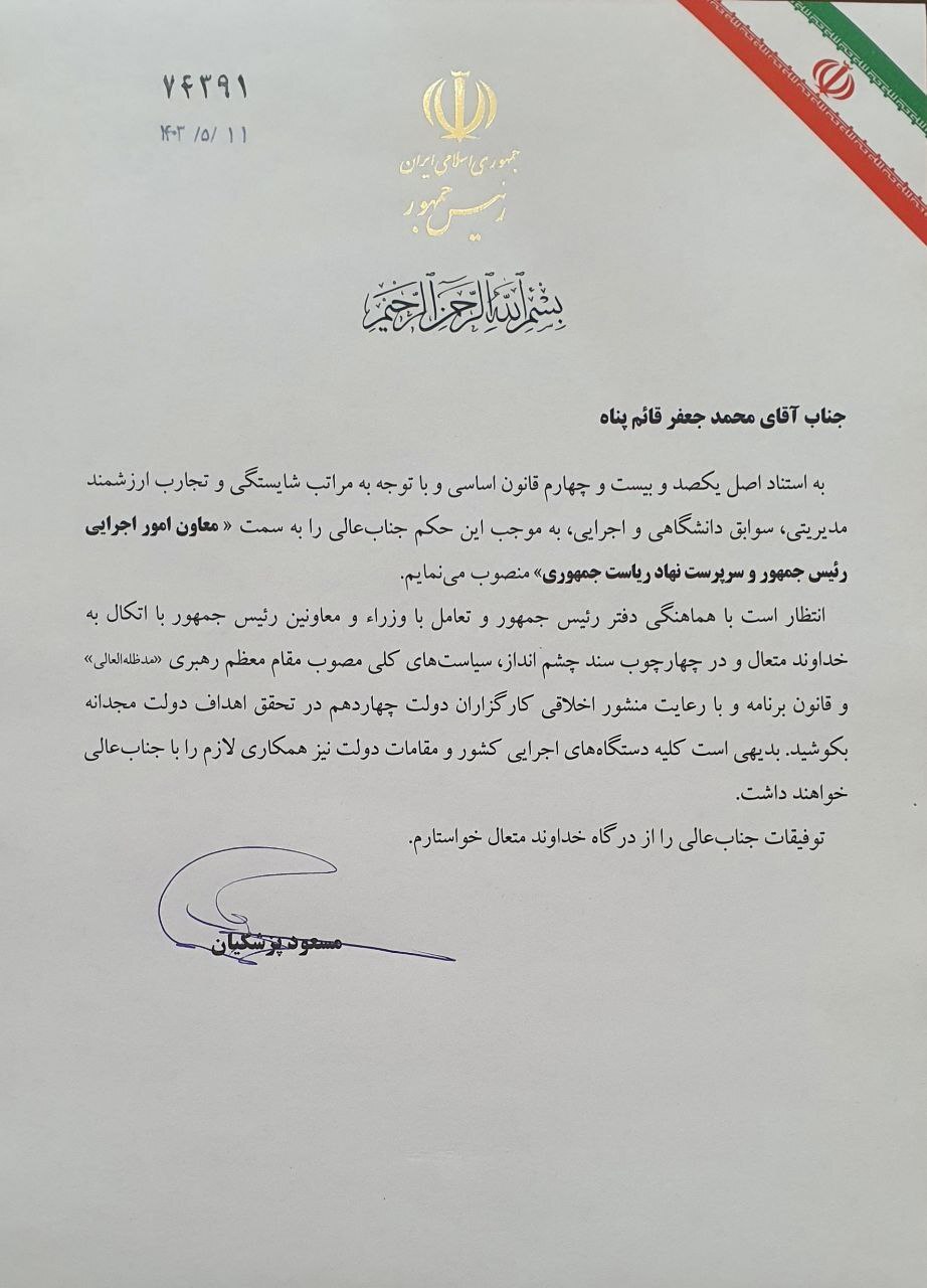رئیسجمهور در حکمی «محمدجعفر قائم پناه» را به عنوان معاون امور اجرایی رئیسجمهور و سرپرست نهاد ریاست جمهوری منصوب کرد.