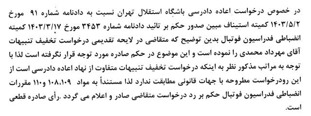 رای تجدید نظر خواهی باشگاه فرهنگی ورزشی پرسپولیس تهران