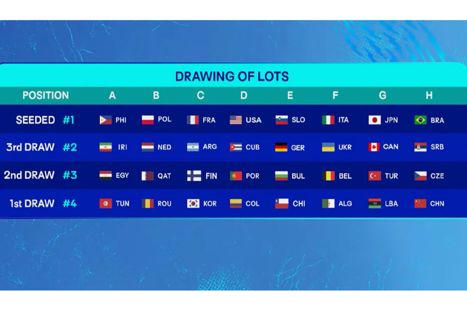قرعهکشی این رقابتها عصر امروز (شنبه ۲۴ شهریور) در مانیل فیلیپین برگزار شد و ۳۲ تیم شرکت کننده در هشت گروه زیر حریفان مرحله گروهی خود را شناختند که تیم ملی والیبال ایران با تیمهای فیلیپین (میزبان)، مصر و تونس در گروه A قرار گرفت: