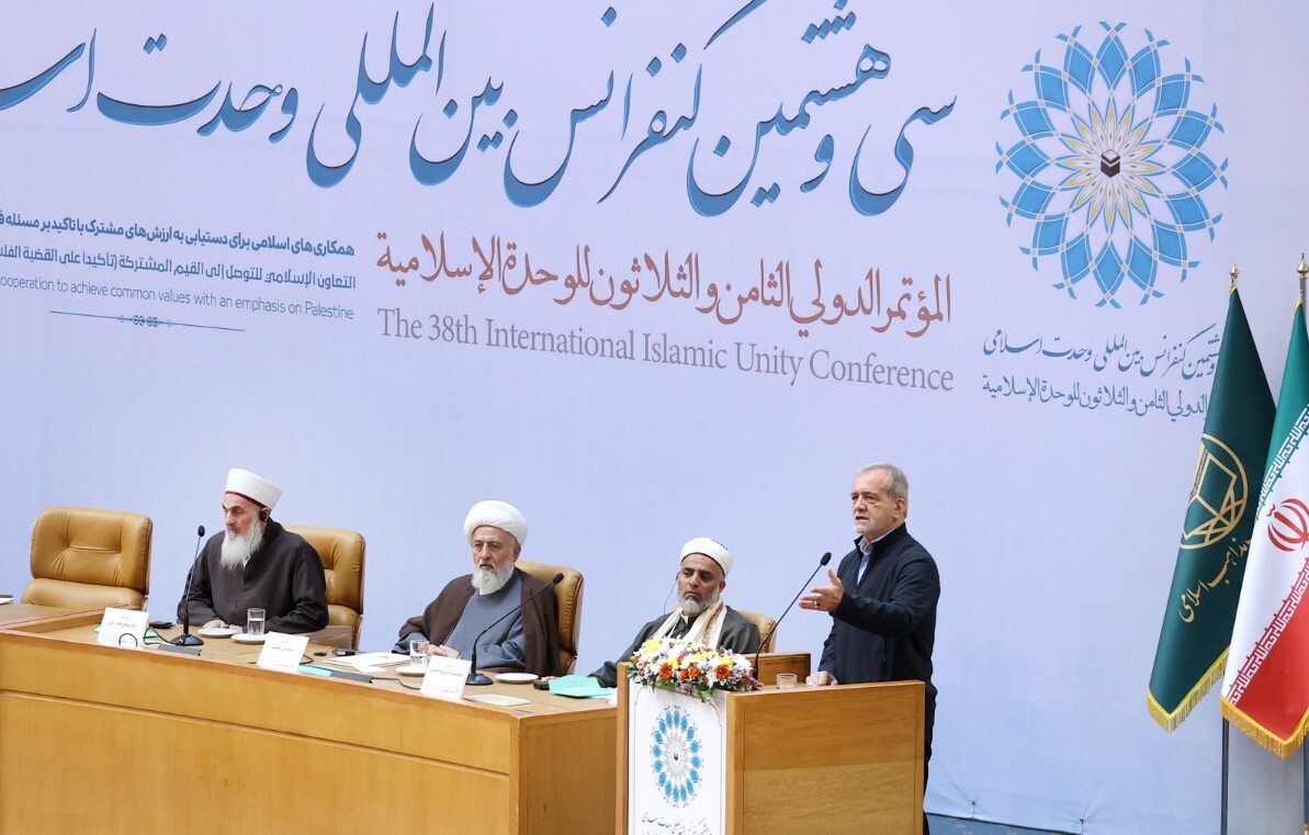 مسعود پزشکیان رئیس جمهور صبح امروز پنجشنبه در افتتاحیه سی و هشتمین کنفرانس بینالمللی وحدت اسلامی با عنوان «همکاریهای اسلامی و دستیابی بر ارزشهای مشترک با تاکید بر مساله فلسطین» با حضور بیش از ۷۸ نفر از علما و فرهیختگان ۳۰ کشور جهان در سالن اجلاس سران با بیان این که دشمن تفرقه را بین ما مسلمانان ایجاد کرده است گفت: پیامبر اسلام بین مردم عرب و مسلمانان الفت و برادری ایجاد کرد.