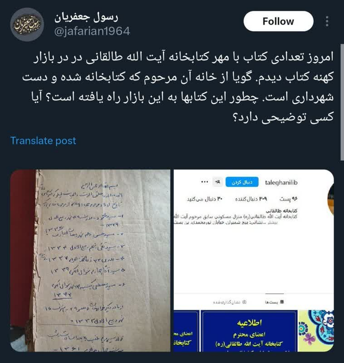 او ادامه داد: ما هم گاهی به آنجا سر میزدیم و خوب بود. اما اخیرا میبینیم که در آنجا قفل شده است و میبینیم که حتی کتابهای آنجا را با همان مهر کتابخانه دارند به بیرون میفروشند! در زادگاه مرحوم طالقانی در طالقان هم کتابخانه داریم. در مجتمع فرهنگی آیت الله طالقانی هم فعالیت داریم و ادامه اش در فضای مجازی. ما نیاز به کتاب داریم. اگر کتابهای کتابخانه آیت الله طالقانی را دارید میفروشید، خب بیایید بفروشید به ما!»