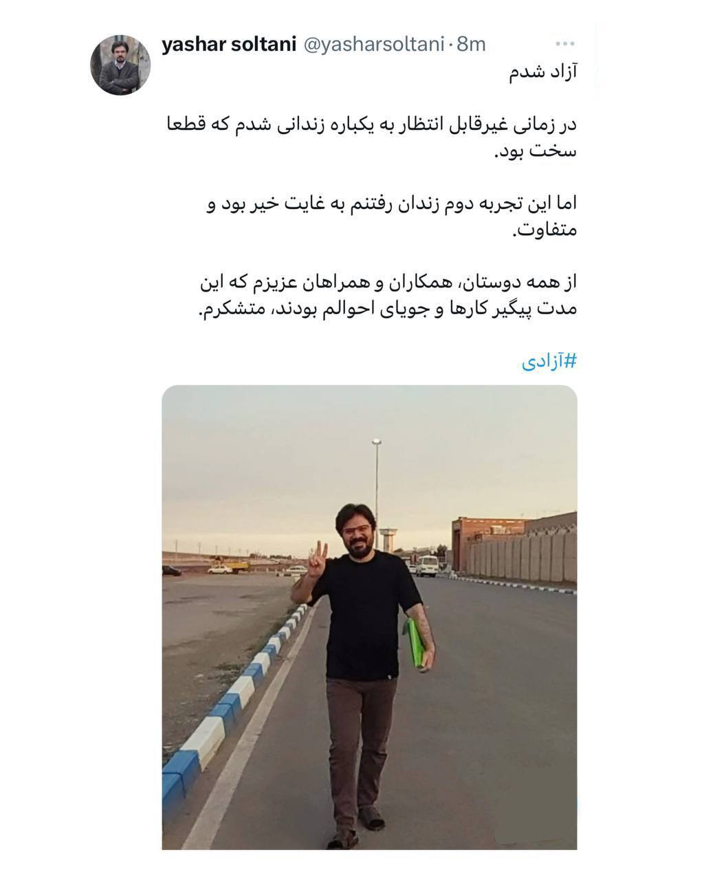 یاشار سلطانی در شبکه ایکس نوشت: «آزاد شدم. در زمانی غیرقابل انتظار به یکباره زندانی شدم که قطعا سخت بود.