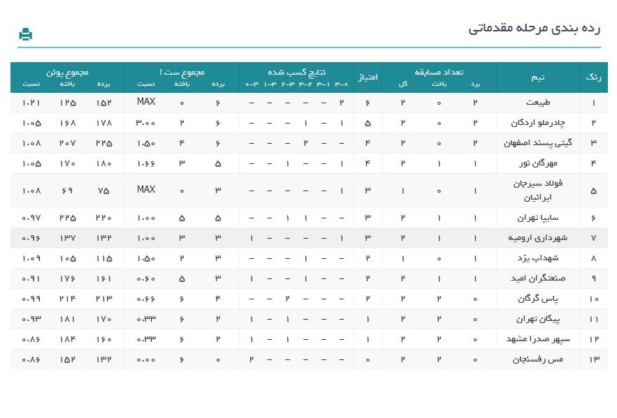 جدول این رقابتها در پایان هفته دوم بدین شکل است: