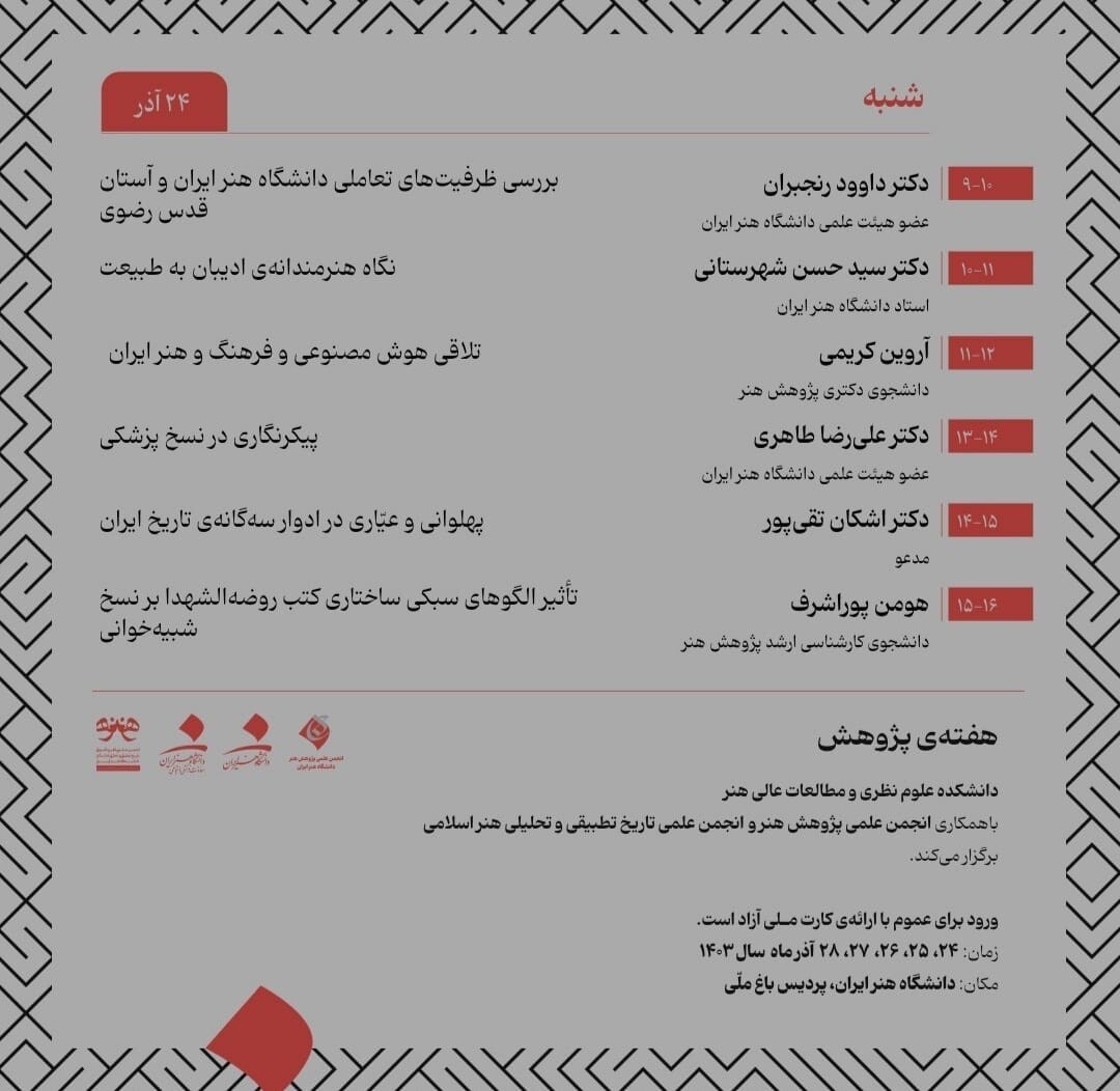 سخنرانیهای علمی هفته پژوهش در دانشگاه هنر ایران را دانشکده علوم نظری و مطالعات عالی هنر ایرانِ با همکاری انجمن علمی پژوهش هنر و انجمن علمی تاریخ تطبیقی و نحلیلی هنر اسلامی برگزار میکند.