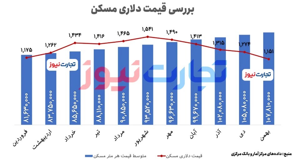 از طرفی متوسط قیمت مسکن در بهمنماه ۱۰۷ میلیون و ۸۱۰ هزار تومان برآورد شد و قیمت دلار نیز به ۹۳ هزار و ۷۰۰ تومان رسید. به این ترتیب قیمت دلاری مسکن در بهمنماه ۱۱۵۱ دلار بوده و کاهش یافته است.