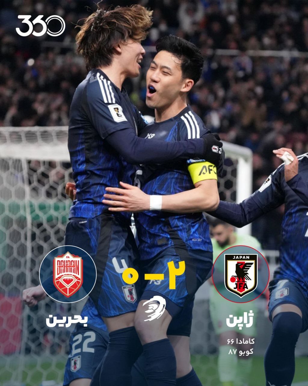 در چارچوب دور هفتم مرحله نهایی انتخابی جام جهانی ۲۰۲۶ در گروه C آسیا امروز (پنجشنبه) تیم ملی فوتبال ژاپن با نتیجه ۲ بر صفر بحرین را از پیشرو برداشت. دائیچی کامادا (۶۶) و تاکفوسو کوبو (۸۷) گلهای ژاپن را زدند تا این تیم با ۱۹ امتیاز و ۹ امتیاز اختلاف نسبت به استرالیا در فاصله سه هفته تا پایان مرحله انتخابی به عنوان اولین تیم به جام جهانی صعود کند.