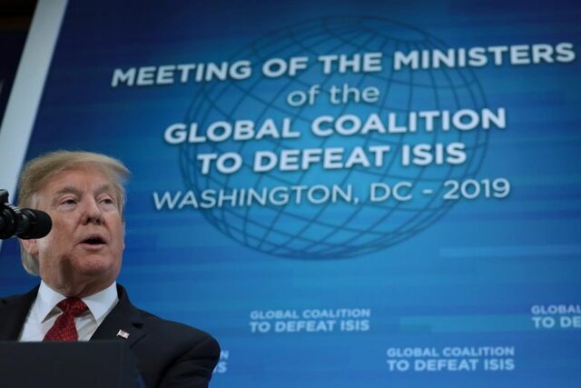 به گزارش فاکس نیوز، ترامپ در جمع نمایندگان ائتلاف آمریکایی ۷۹ عضوی ضد داعش در واشنگتن گفت با وجود اینکه تصمیم به خروج نظامیان کشورش از سوریه گرفته شده است، آمریکا در جنگ با باقیمانده شبه‌نظامیان این گروه افراطی رحم نخواهد کرد. به گفته او، این شبه‌نظامیان تنها درصد اندکی از اراضی هنگفت را که عنوان "خلافت" اعلام کردند در دست دارند.