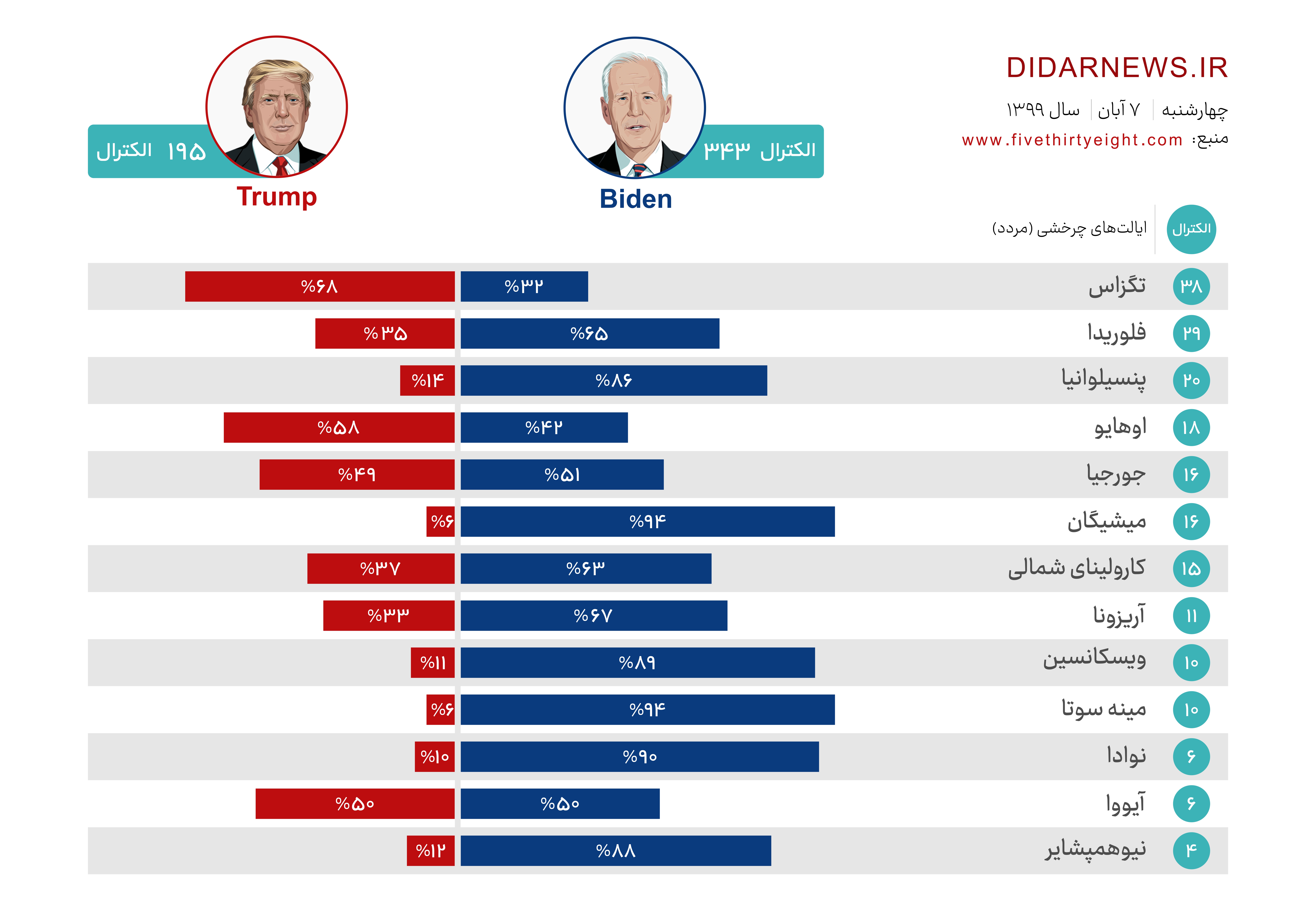 سایت five thirty eight در ۱۳ ایالت چرخشی آمریکا از جلو بودن بایدن از ترامپ خبر میدهد و احتمال ۳۴۳ رأی الکترال برای بایدن و ۱۹۵ الکترال برای ترامپ پیشبینی کرده است.