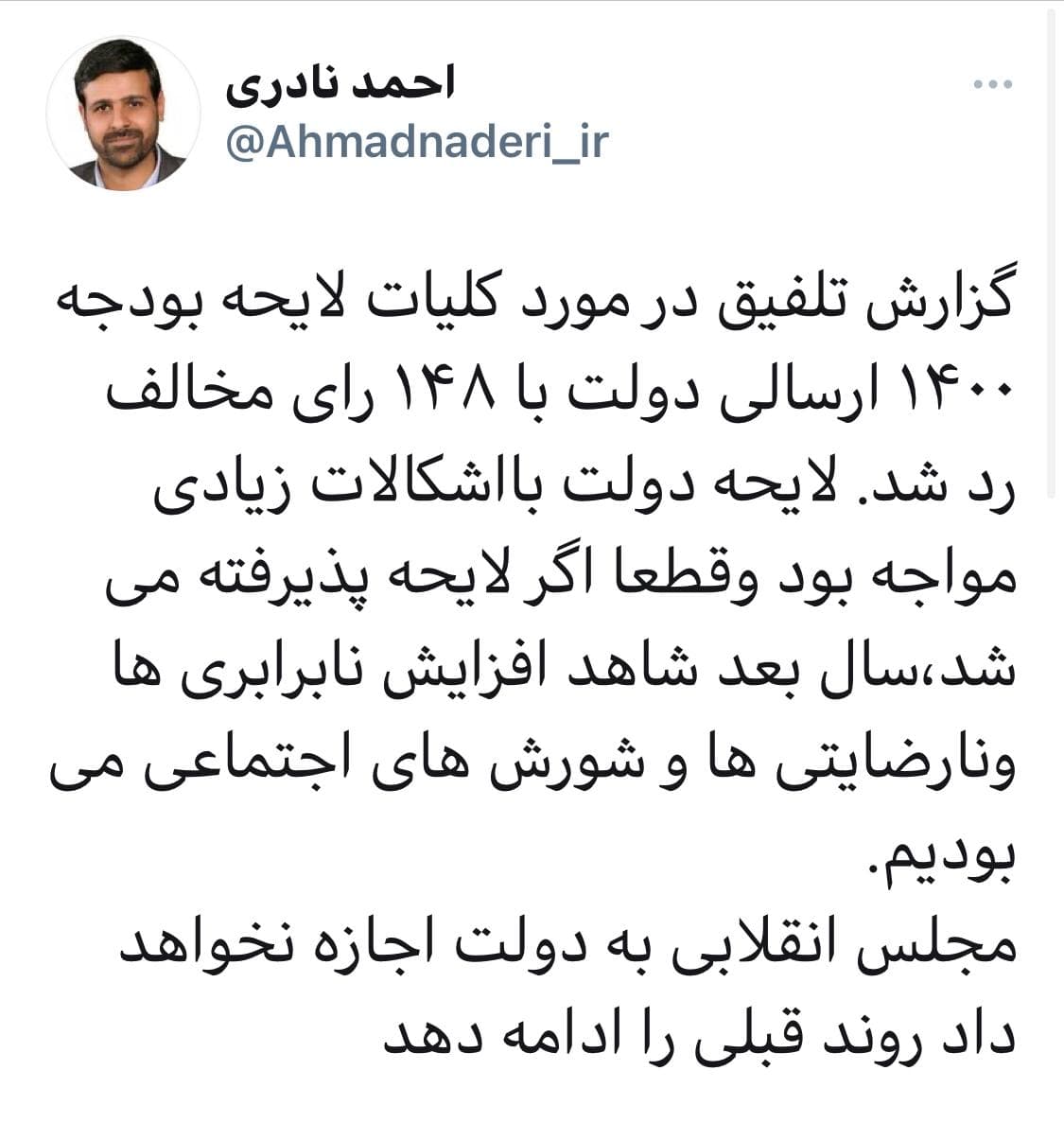 دیدارنیوز ـ احمد نادری در توییتر نوشت: «گزارش تلفیق در مورد کلیات بودجه ۱۴۰۰ ارسالی دولت با ۱۴۸ رای مخالف رد شد. لایحه دولت با اشکالات زیادی مواجه بود و قطعا اگر لایحه پذیرفته می‌شد، سال بعد شاهد افزایش نابرابری‌ها و نارضایتی‌ها و شورش‌های اجتماعی بودیم. مجلس انقلابی اجازه نخواهد داد دولت روند قبلی را ادامه دهد.»
