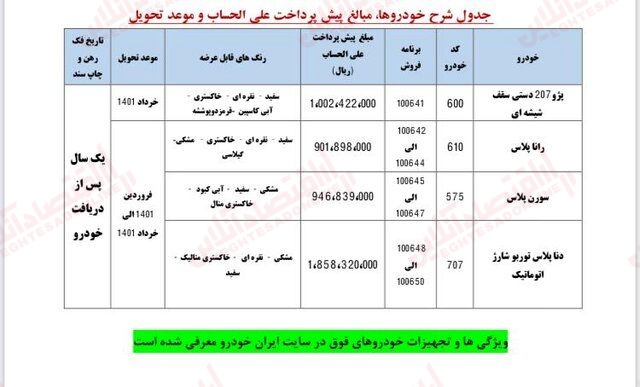 مشتریان نهایی، ظرف مدت پنج روز فرصت دارند که وجه علیالحساب خودرو را مطابق جدول از طریق همان سایت فروش اینترنتی محصولات ایران خودرو پرداخت کنند و الباقی وجه خودرو در زمان ارسال دعوتنامه با لحاظ هزینههای قانونی تعیین و دریافت خواهد شد.